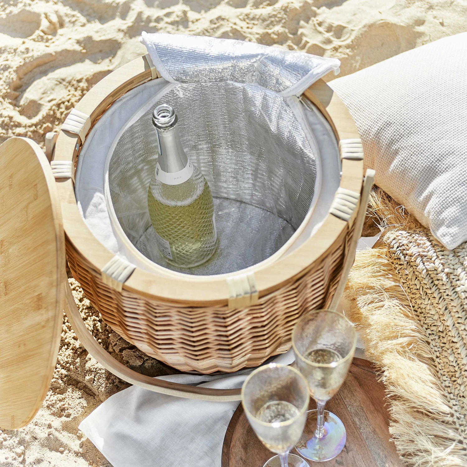 Beim nächsten Ausflug ins Grüne ist der naturfarbene The Great Outdoors Picknickkorb mit von der Partie. Unter dem abnehmbaren Bambus Deckel, der sich beim Picknick als Servierplatte nützlich macht, hält eine isolierte Kühltasche mit Reißverschluss Ihre Salate, Sandwiches und Drinks schön kühl. Der hochwertige Korb mit Holzgriff ist handgefertigt, lebensmittelecht und kann mit einem feuchten Tuch gereinigt werden.